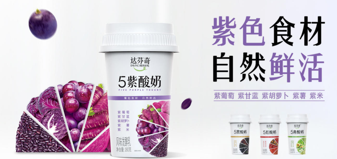 达芬奇五紫酸奶,精选紫米、紫薯、紫甘蓝、紫葡萄和紫胡萝卜五种富含花青素的天然食材,为你带来缤纷的色彩和轻盈的滋养。此外,还特别添加了10种益生菌,致力于维护肠道的健康。