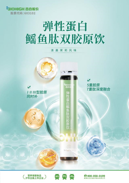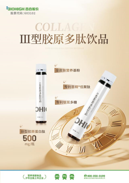 (上下滑动,查看更多产品) 前花青素Ⅲ型胶原多肽饮 人体衰老表现为真皮层的胶原蛋白流失,胶原蛋白的含量随着年龄增长而不断流失。25岁之后胶原蛋白开始加速流失,其中III型胶原蛋白流失速度比I型胶原蛋白更快。 目前市场中,饮品为当下最主流的口服胶原蛋白肽产品形态。百合股份作为营养保健食品行业的头部企业,针对消费者普遍痛点及考虑因素,配方创新,使用前瞻性原料打造一款——“前花青素Ⅲ型胶原多肽饮”。采用了双胶原配方,Ⅰ型和Ⅲ型同时补充,胶原含量达到15000mg/瓶 ,同时添加了海岸松来源的前花青素及牛肝菌粉等多重植萃成分,含有弹性蛋白和透明质酸钠,维生素的添加也采用了经典的ACE组合,帮助达成消费者内调外养的需求。