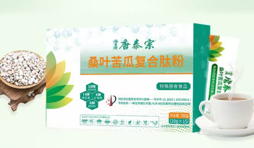 (上下滑动,查看更多产品) 唐泰宗?桑叶苦瓜复合肽粉 三十三味天然控糖 成分表: ? 10味药食同源:薏苡仁、山药、桑叶、肉桂、枸杞、黄精、葛根、玉竹、茯苓、罗汉果 ? 8种植物原料:膨化玉米粉、大豆分离蛋白、菊粉、膨化燕麦粉、苦瓜肽粉、豌豆肽粉、圆苞车前子壳粉、草果粉 ? 10种维生素:VA、VC、VD3、Ve、VB1、VB2、VB6、VB12、叶酸、烟酸 ? 4种矿物质:钙、铁、锌、镁 ? 1种益生菌:专利活性菌(鼠李糖乳杆菌YLR-005)