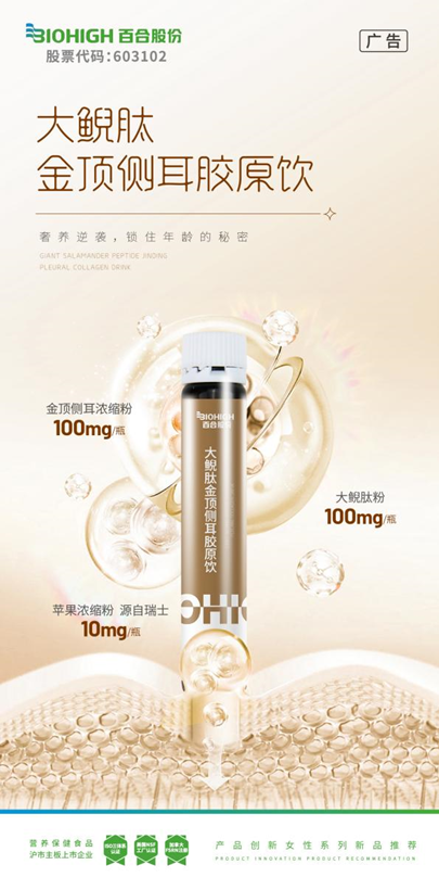 大鲵肽金顶侧耳胶原饮 【全方位深源赋活,矩阵式奢愈逆生】 从细胞层到基底层,层层进阶 修愈:大鲵肽促进修复,鳐鱼肽增加真皮厚度和密度,透明质酸钠补水保湿 再生:苹果浓缩粉带入苹果干细胞,利于新细胞再生,基因抗老 焕新:PQQ根源强韧基底膜,补充细胞,延缓衰老;麦角硫因补充端粒酶维持端粒长度,将老化细胞降解转化构成新细胞 【1瓶小于半个苹果的热量1】 1瓶大鲵肽金顶侧耳胶原饮≈20大卡,小于1/4个苹果≈23大卡 【第三方权威机构检测2】 0糖、0添加防腐剂(山梨酸、苯甲酸)