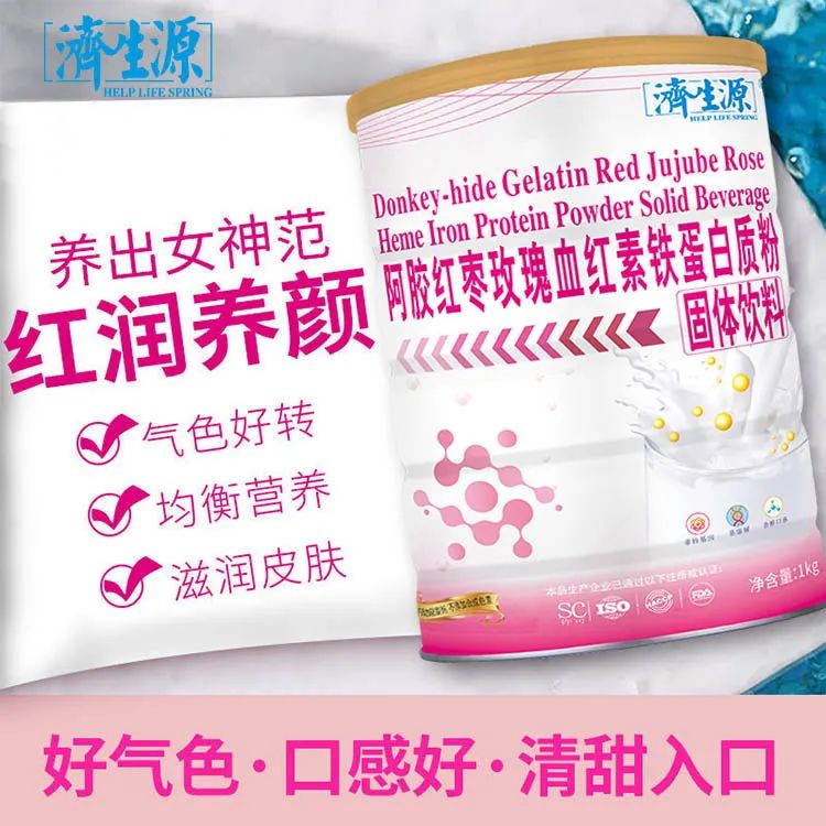 济生源?阿胶红枣玫瑰血红素铁蛋白质粉 济生源阿胶红枣玫瑰血红素铁蛋白质粉是一款营养丰富的健康食品。其主要成分包括阿胶、红枣、玫瑰、血红素铁以及优质蛋白质,这些成分协同作用,能够补血养血、增强免疫力、改善贫血状况,并有助于维持身体正常的新陈代谢。此外,该产品还富含多种维生素和矿物质,如铁、维生素C等,进一步增强了其营养价值。血红素铁作为本产品的特别添加成分,进一步增强了其补血养血的功效,使消费者能够更便捷、更有效地补充身体所需的铁元素。其适用人群广泛,特别适合女性、老年人以及体质虚弱者食用。总之,济生源阿胶红枣玫瑰血红素铁蛋白质粉以其独特的配方和丰富的营养成分,成为追求健康生活的消费者的优选之一。