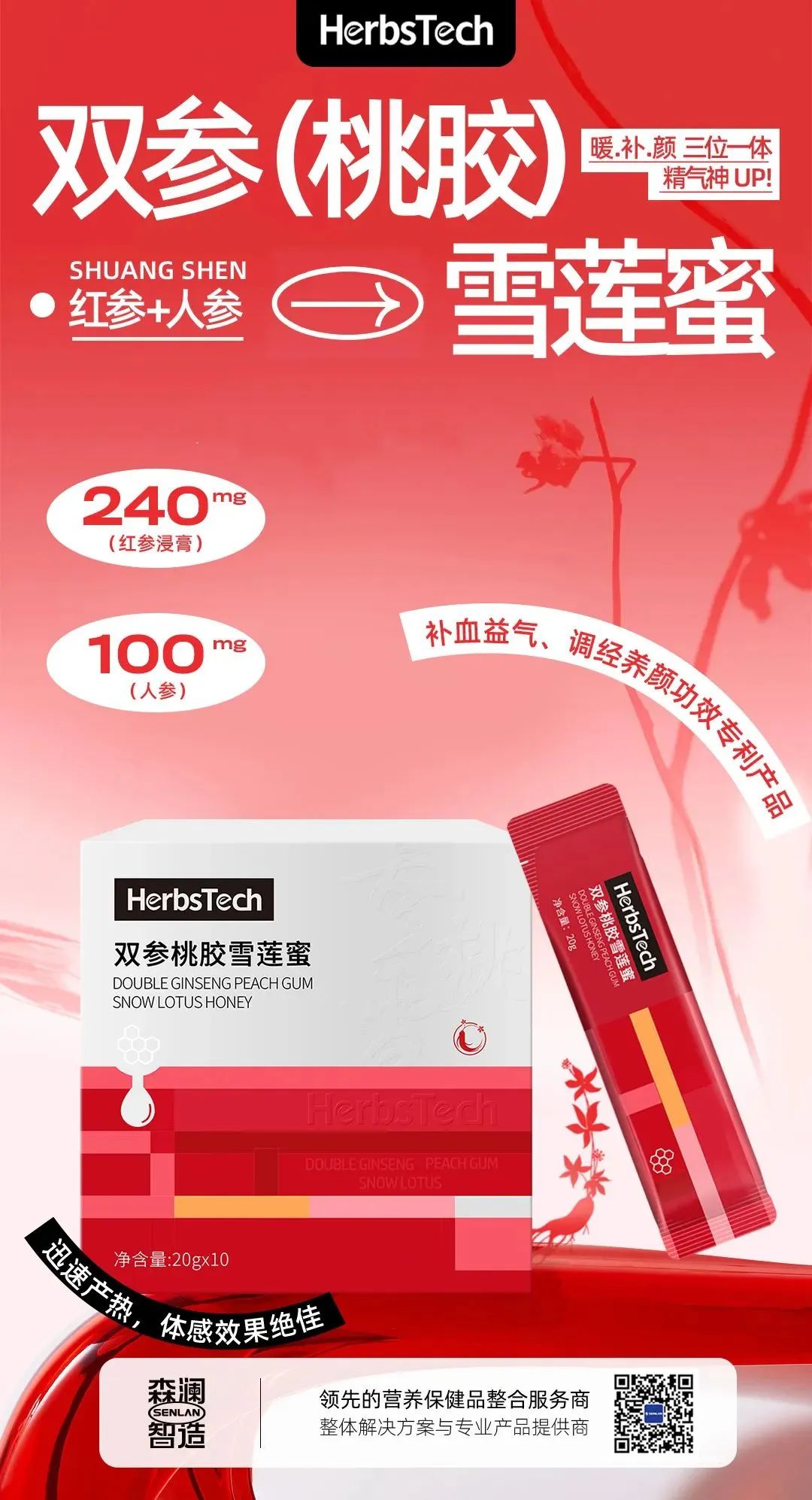 女子以血为本,一生中耗血失血比男性要更多,对于女性而言,气血更为重要。数据显示,气血健康消费者超七成为女性,年龄段集中在30-40岁的中青年阶段,产品效果是消费者选购产品的首要考虑因素。针对消费者普遍痛点及考虑因素,森澜精心打造了一款集“暖、补、颜”三位一体的产品——“双参桃胶雪莲蜜”,旨在满足气血两亏、肝肾阴虚、月经不调等人群的不同需求。