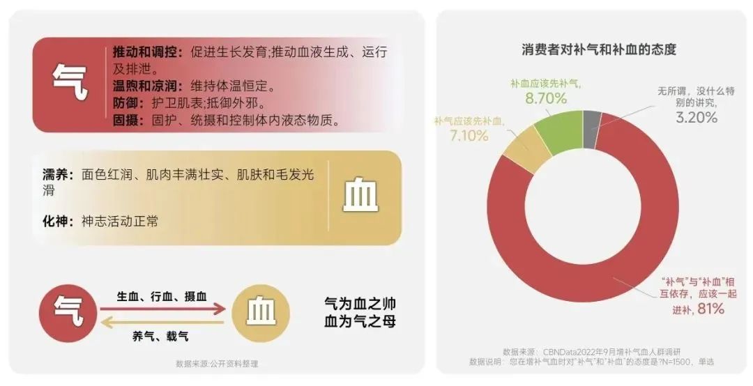 中医理论主张气血充足,经络通畅,脏腑功能强大,能帮助身体构建更好的免疫体系,既能及时清理内部毒素,又能抵御外来因素。实际上,消费者气血不足现象较为普遍,失眠多梦占比高达65%,相比起来,男性更易出现脱发,而女性则易出现经期不适。根据调查,81%的消费者认同补气与补血是相辅相成的,主张两者应同步进行补充。