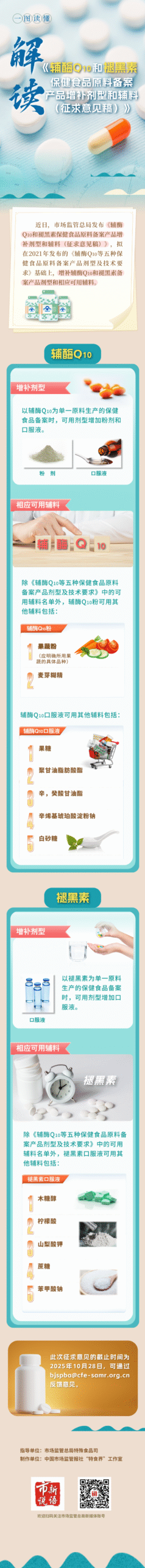 近日,市场监管总局发布《辅酶Q10和褪黑素保健食品原料备案产品增补剂型和辅料(征求意见稿)》,拟在2021年发布的备案产品剂型及技术要求基础上,进一步增补辅酶Q10和褪黑素备案产品剂型和相应可用辅料。
