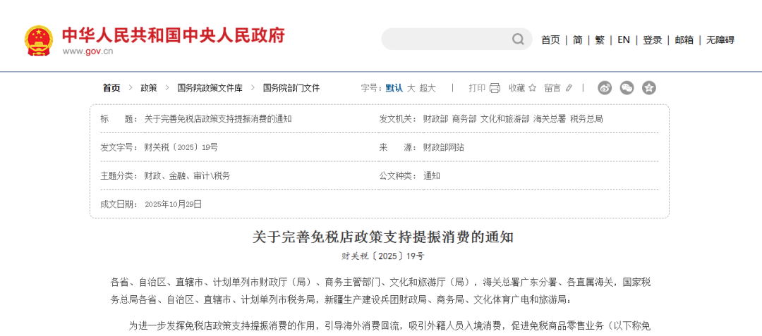 10月31日消息,日前,财政部等五部门印发《关于完善免税店政策支持提振消费的通知》(以下简称《通知》),明确自2025年11月1日起完善免税店政策,旨在进一步发挥免税店政策支持提振消费的作用,促进免税商品零售业务健康有序发展。