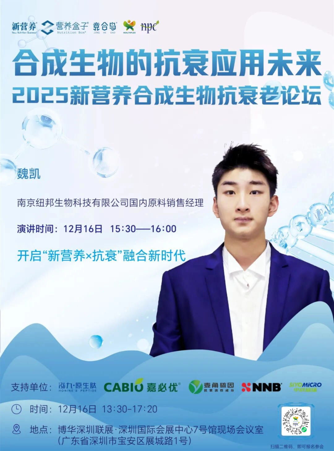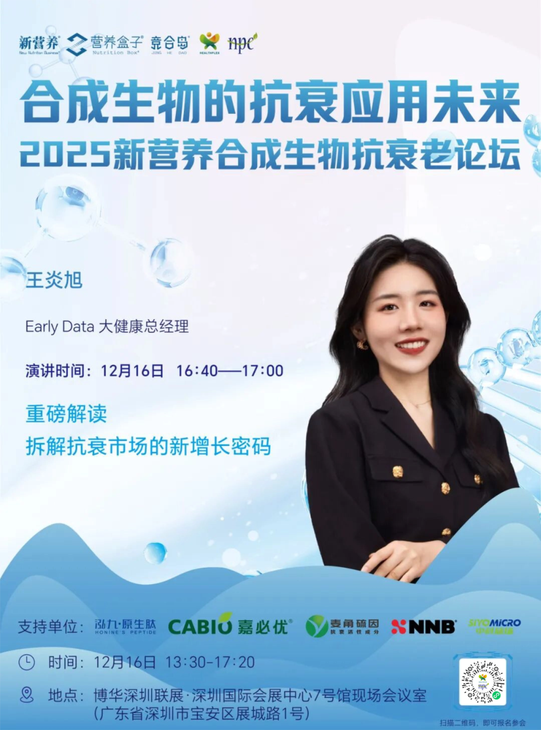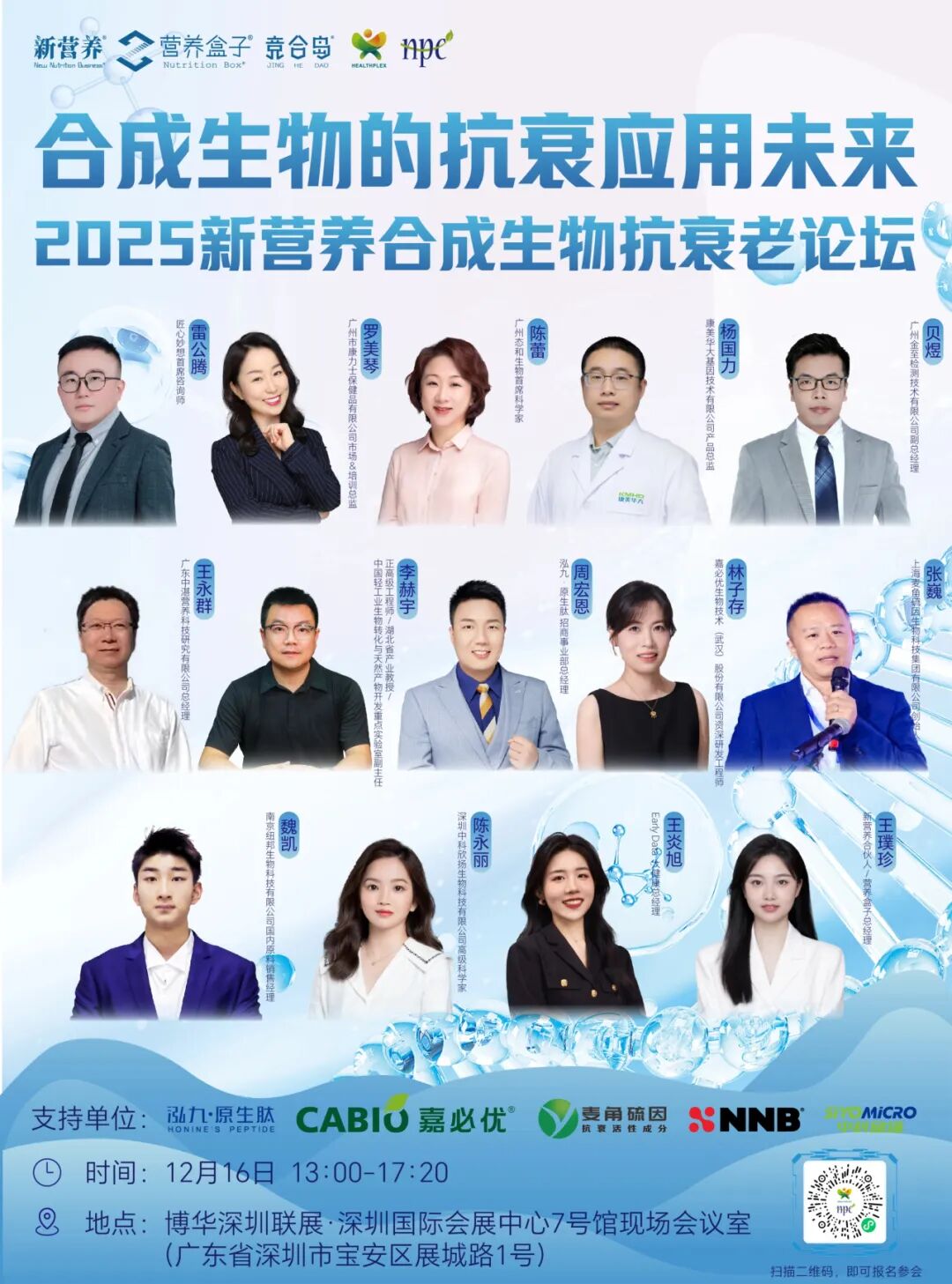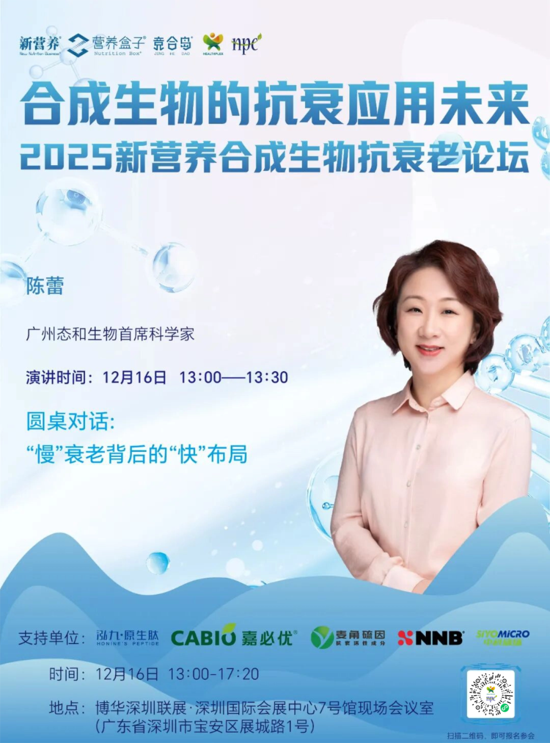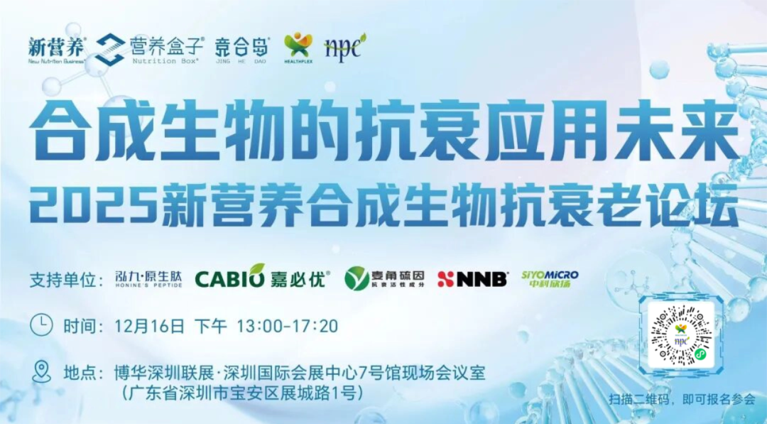 在此背景下,新营养将于12月16日“HNC健康营养展(深圳)”期间,在深圳举办「2025新营养合成生物抗衰老论坛」。论坛以“合成生物的抗衰应用未来”为主题,汇聚行业顶尖专家、企业领袖及科研机构。在论坛上,各方将共同探讨抗衰产品开发的创新路径,分享最新的科研成果和实践经验。这不仅为行业提供了一个交流与合作的平台,更为抗衰行业的未来发展提供了前瞻性洞察与可落地解决方案。