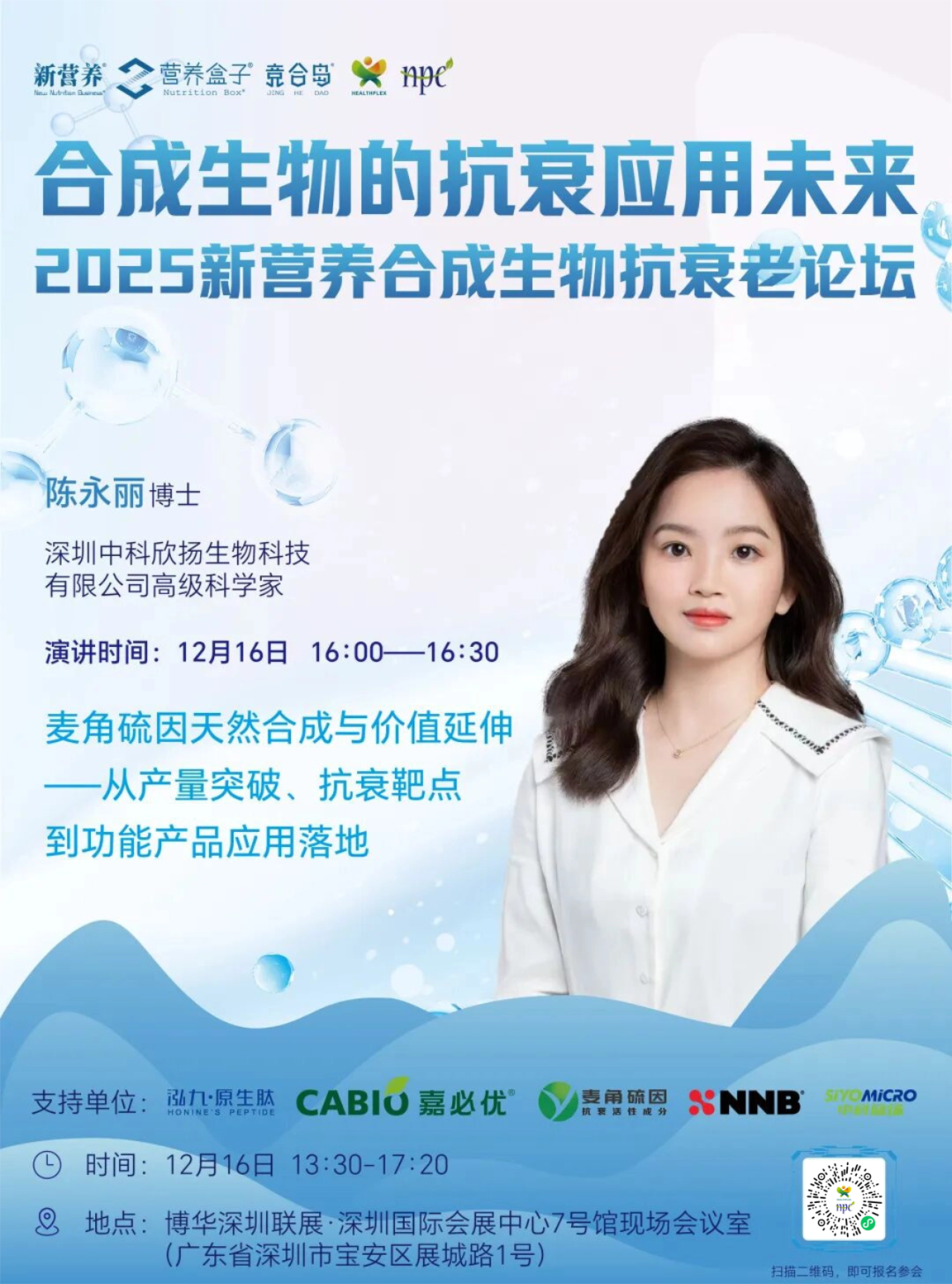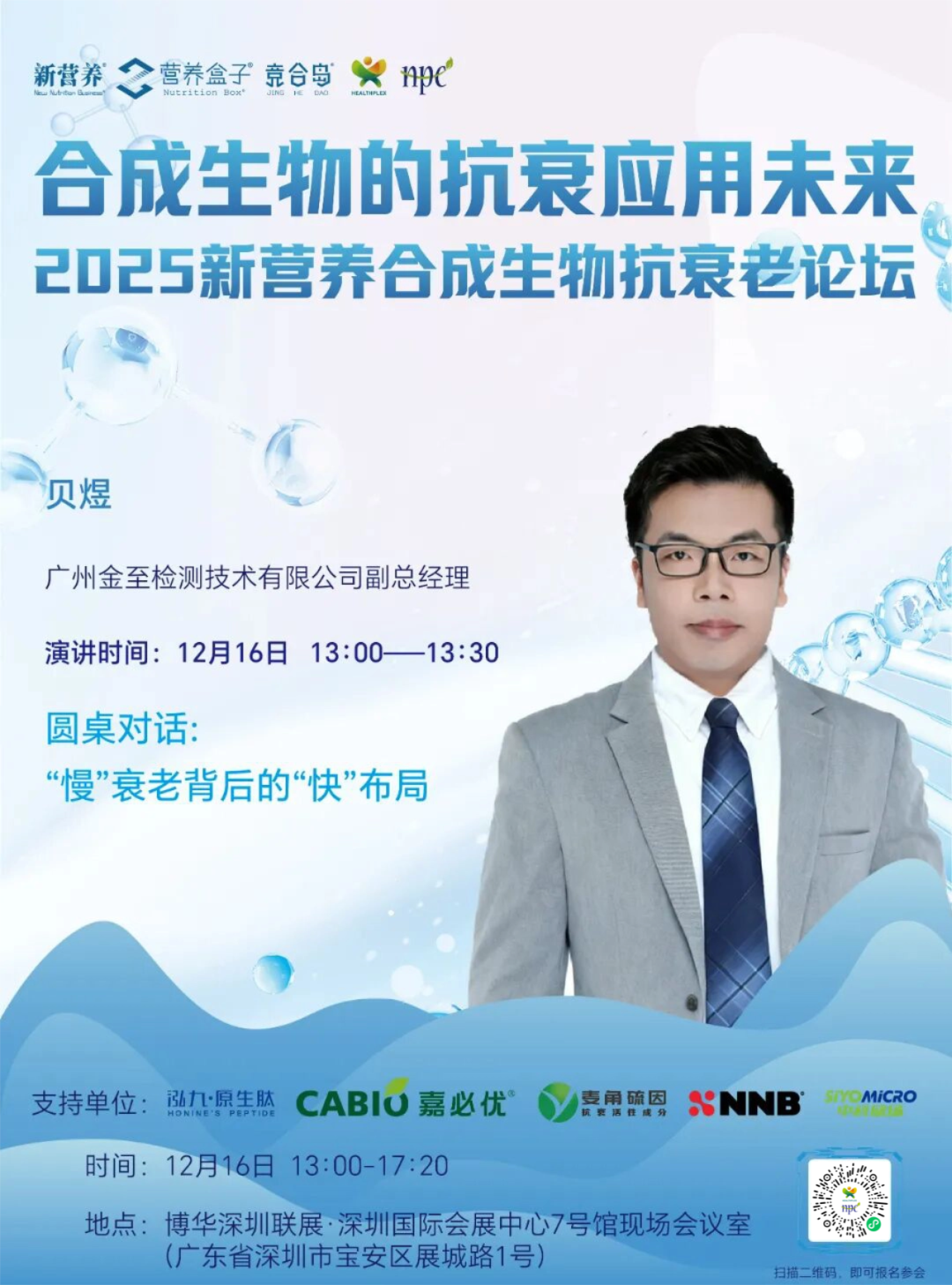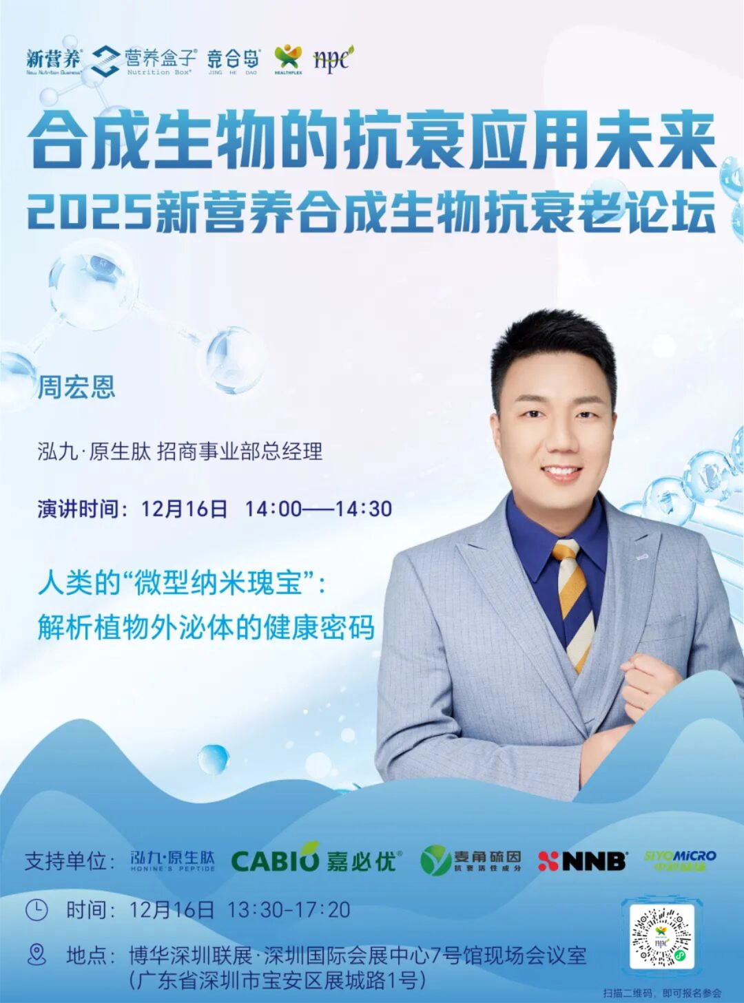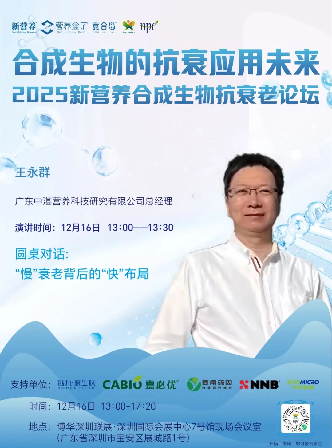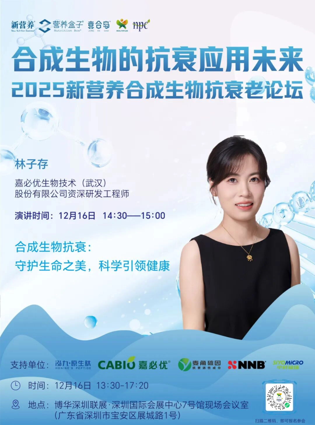 在此背景下,新营养将于12月16日“HNC健康营养展(深圳)”期间,在深圳举办「2025新营养合成生物抗衰老论坛」。论坛以“合成生物的抗衰应用未来”为主题,汇聚行业顶尖专家、企业领袖及科研机构。在论坛上,各方将共同探讨抗衰产品开发的创新路径,分享最新的科研成果和实践经验。这不仅为行业提供了一个交流与合作的平台,更为抗衰行业的未来发展提供了前瞻性洞察与可落地解决方案。