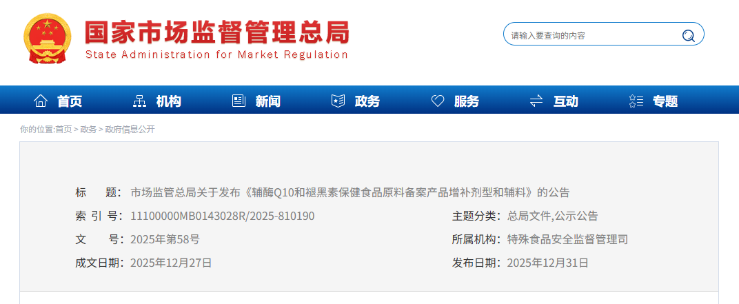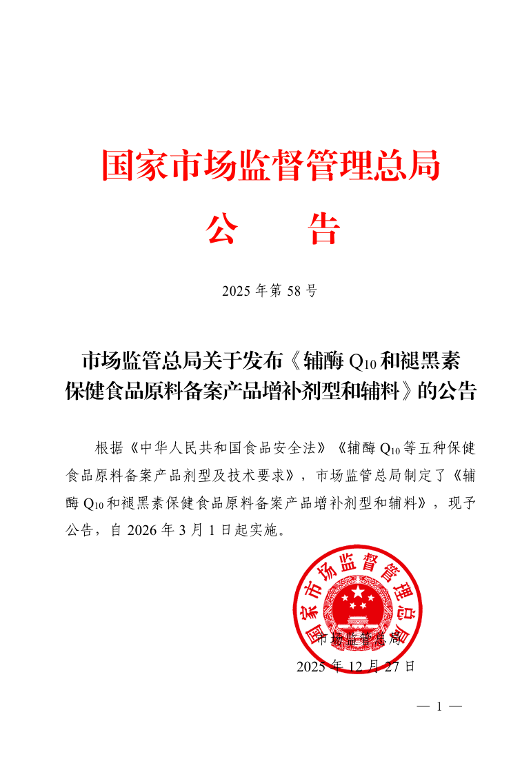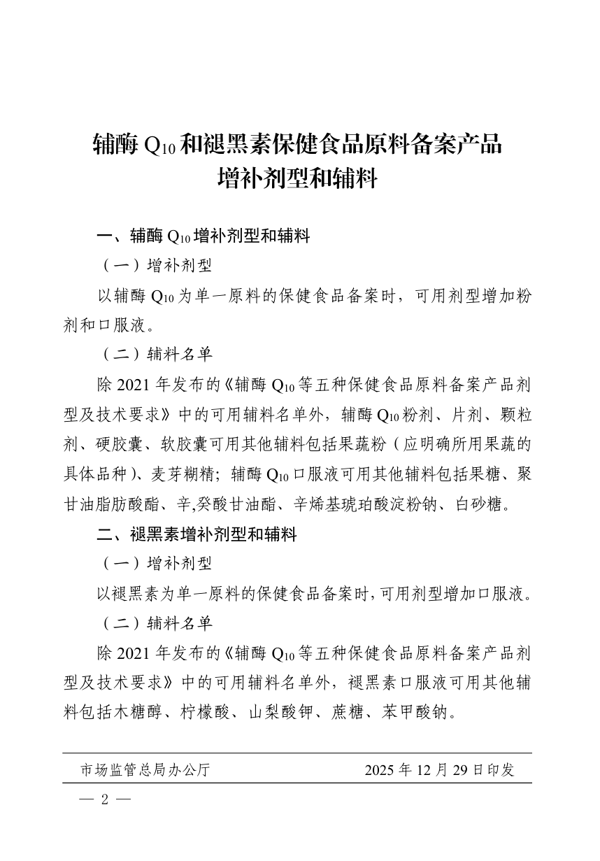 12月31日,市场监管总局发布《辅酶Q10和褪黑素保健食品原料备案产品增补剂型和辅料》的公告(以下简称公告),在2021年发布的备案产品剂型及技术要求基础上,进一步增补辅酶Q10和褪黑素备案产品剂型和可用辅料。此举旨在贯彻落实党中央、国务院关于实施健康中国战略、发展银发经济的决策部署,深入推进保健食品注册备案双轨运行,优化适老化产品供给,培育经济发展新动能。
