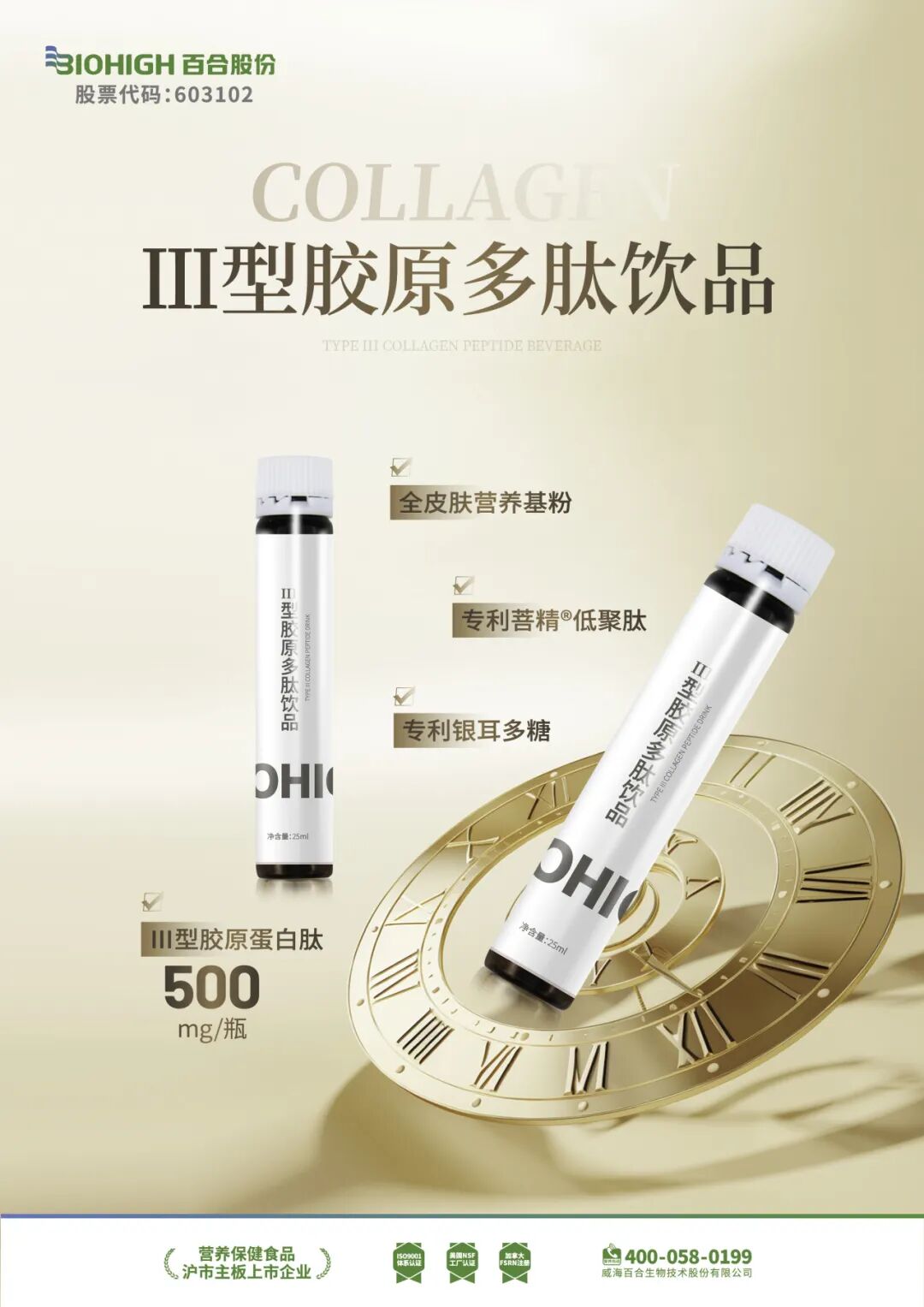 目前市场中,饮品为当下最主流的口服胶原蛋白肽产品形态。百合股份作为营养保健食品行业的头部企业,针对消费者普遍痛点及考虑因素,配方创新,使用前瞻性原料打造一款——“前花青素Ⅲ型胶原多肽饮”。采用了双胶原配方,Ⅰ型和Ⅲ型同时补充,胶原含量达到15000mg/瓶 ,同时添加了海岸松来源的前花青素及牛肝菌粉等多重植萃成分,含有弹性蛋白和透明质酸钠,维生素的添加也采用了经典的ACE组合,帮助达成消费者内调外养的需求。