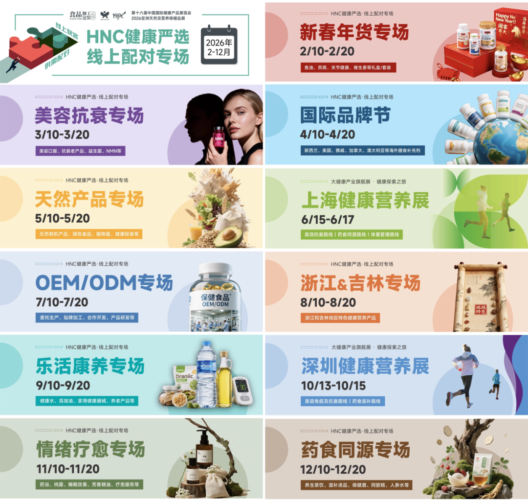 作为HNC健康营养展重要的线上活动,“HNC健康严选 · 线上配对专场”今年焕新登?。NC健康严选以十一大主题贯穿2-12月,每月一次以不同细分板块帮助展商在线展示,并配套渠道推广社群传播为展商定制非展期营销方案,完成线上供需配对,为展商和观众构建了创新型线上对接平台,为企业留住每一位非展期意向客户。