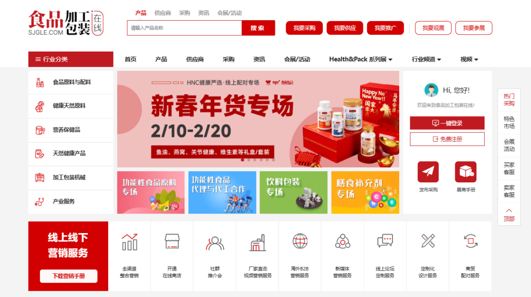 创立于2015年,网站拥有6,000万+平台年度流量、90,000+活跃采购商、8,000+领先供应商。网站致力于帮助用户直达商品信息和优质商家,为企业提供专业性贸易撮合与促进服务,行业涵盖营养保健品、天然健康产品、健康天然原料、加工包装机械,以及食品、饮料、日化等领域。