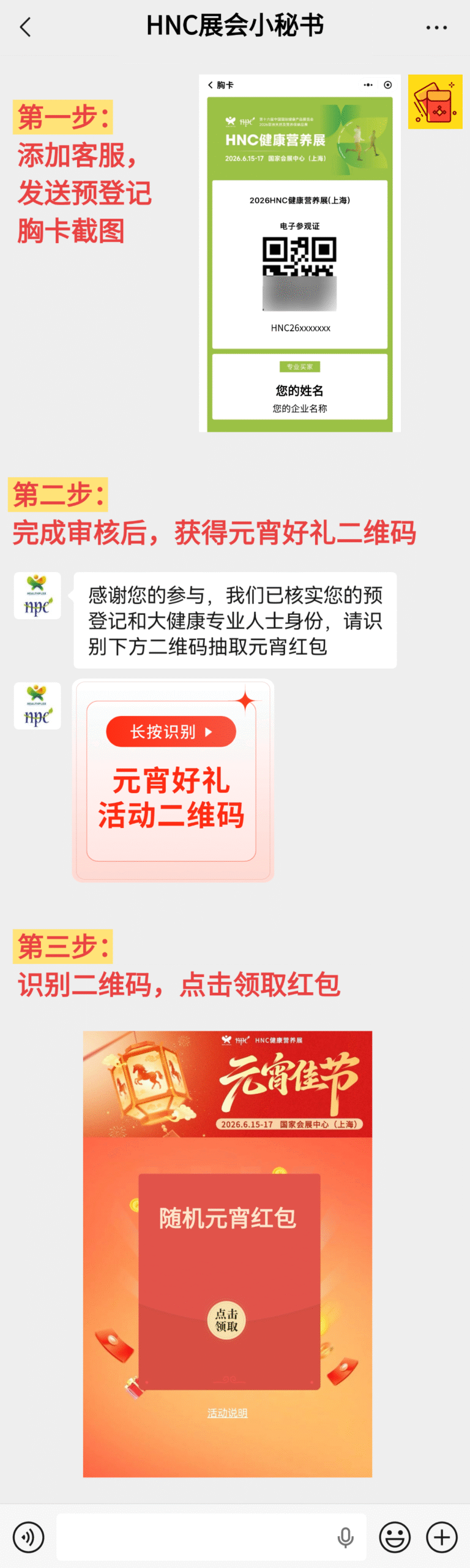 即日起至3月3日16点,成功完成HNC健康营养展观展注册的专业观众朋友们,可联系客服领取随机元宵红包一份,红包领取后将直接发放至微信钱包。数量有限,送完为止。
