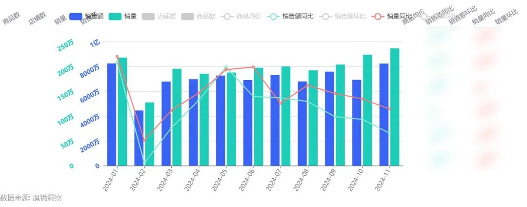 魔镜分析+ 监测数据显示,2025年1-11月,主流电商平台中果子熟了在五指毛桃赛道表现亮眼,销售额达671.79 万元,同比增速飙升至 1724.2%,凭借对年轻群体养生需求的深刻洞察,快速抢占赛道红利。