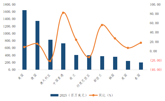 从进口市场看,美国、德国、澳大利亚、中国香港和荷兰是我国前五大进口来源地,合计市场份额占全年进口总额的59.8%,市场集中度保持高位。美国凭借16.46亿美元的进口规模,继续稳居我国第一大进口来源国,全年同比增长8.6%,市场份额为19.9%,与2024年基本持平,显示出在国内高端营养健康消费市场中,美国产品的品牌影响力和渠道渗透力依然稳固。