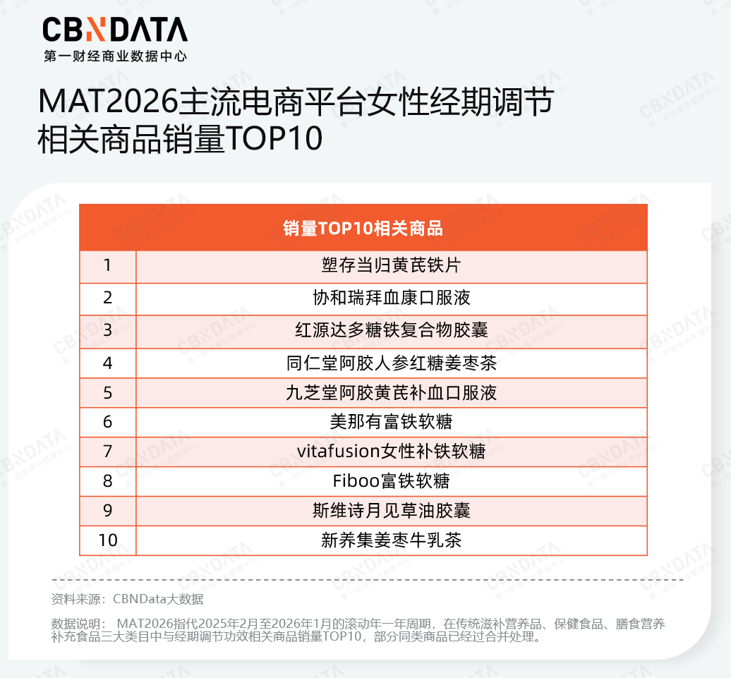 具体看到热销商品,可以明显看出女性对经期调节的消费偏好呈现出明显的“去药化”与“日?;鼻魇啤AT2026女性经期调节相关商品销量TOP10显示,女性在进行长期经期补充时,表现出对天然补充剂与药食同源食品的高度信任。销量前列的产品中涵盖了当归、黄芪、阿胶、人参、红枣、姜、桑葚等传统中式滋补成分,基于药食同源逻辑的产品(如阿胶红糖姜枣茶)正成为女性调理气血、应对经期波动的核心选择。