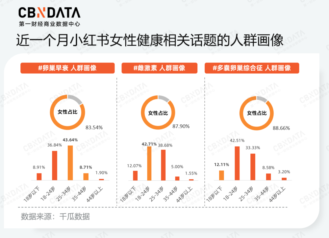另一方面从人群画像中也可以看到女性已经在主动识别自己所处的节律阶段,以此锚定自己的身体问题,寻求解法。18-24岁群体在#雌激素?话题中占比高达42.71%,她们侧重于激素对皮肤状态的影响;18岁以下的用户在#多囊卵巢综合征?话题中占比高于该年龄段在另外两个话题的占比,未成年女性也开始从科学的角度关注青春期生理发育与日常健康管理。随着生命节律向围绝经期移动,25-34岁以及35岁-44岁的女性在#卵巢早衰?话题下的占比远超其在雌激素及多囊话题中的比例。