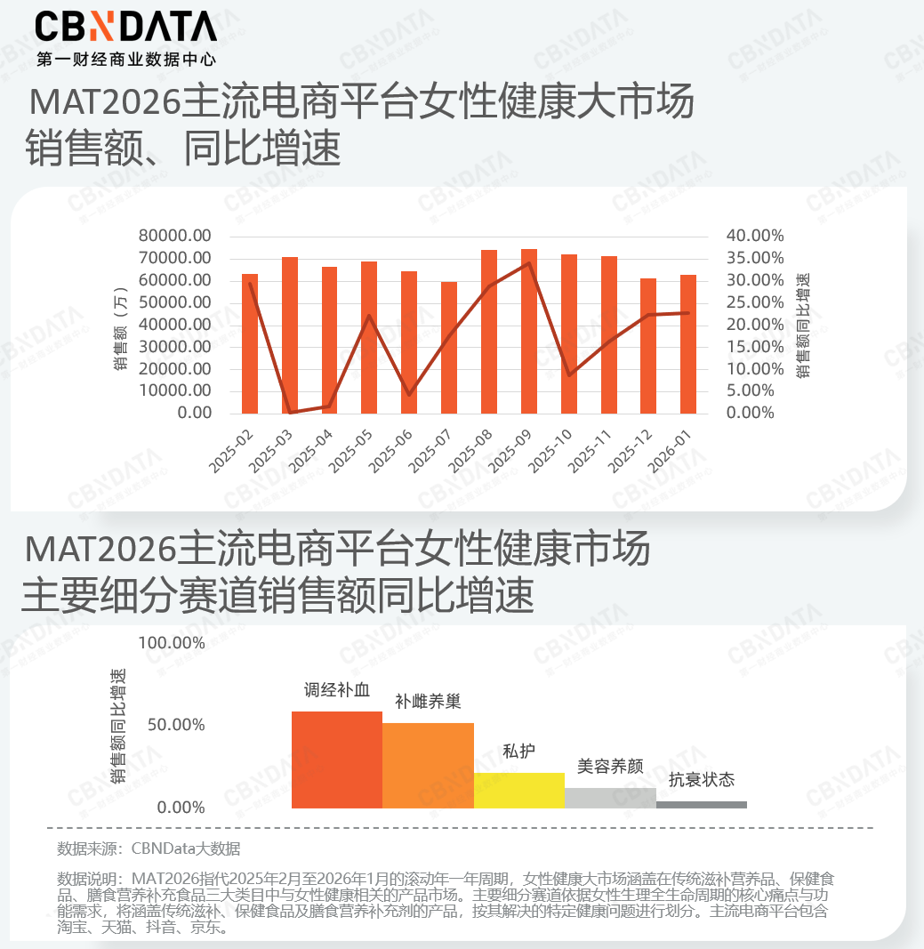 MAT2026期间,女性健康大市场的整体销售规模呈现稳健波动的态势,在整体平稳的曲线下,细分赛道的增速呈现出显著的分化趋势。其中,调经补血与补雌养巢赛道的销售额同比增速分别达到约60%和50%,高于同期私护、美容养颜及抗衰状态的增速。