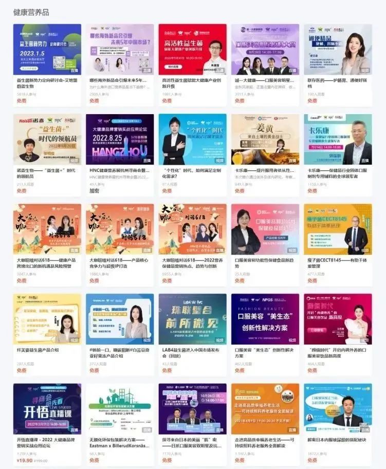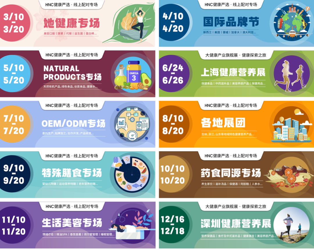 HNC健康严选以十大主题贯穿3-12月,每月一次以不同细分板块帮助展商在线展示,并配套渠道推广和直播活动为展商定制非展期营销方案,完成线上供需配对,为展商和观众构建了创新型线上对接平台,为企业留住每一位非展期意向客户。
