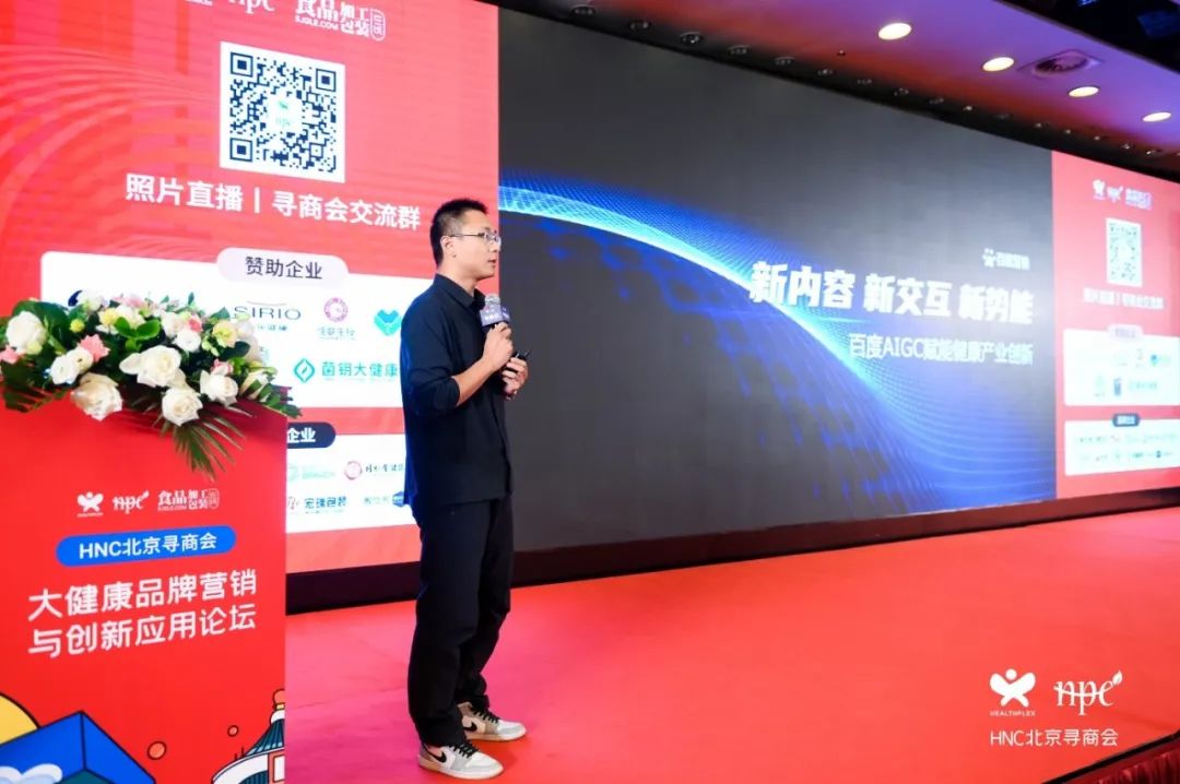 百度MEG销售业务平台三品一械行业华北区域总监郑嵩,进行了主题为“新内容 新交互 新势能,百度AIGC赋能健康产业创新”的精彩分享。他表示,疫后网民对营养保健产品愈加关注,爆款产品在百度有更多用户聚焦,多品类产品的认知需求呈上涨态势,前十需求产品为维生素、燕窝、养生茶、益生菌、钙片、阿胶等,前十增产品为降糖奶粉、辅酶Q10、枸杞原浆、鱼油、燕窝等。用户在百度“搜搜看看”的同时,也在形成消费转化。与此同时,百度AIGC智能涌现,赋能电商直播场景、提升内容生产力、打造数字人传递品牌声量、创造热点话题冲击热搜霸榜引流,借势热点共创IP等等,从不同角度分享百度AIGC为品牌企业带来的全新发展领域。